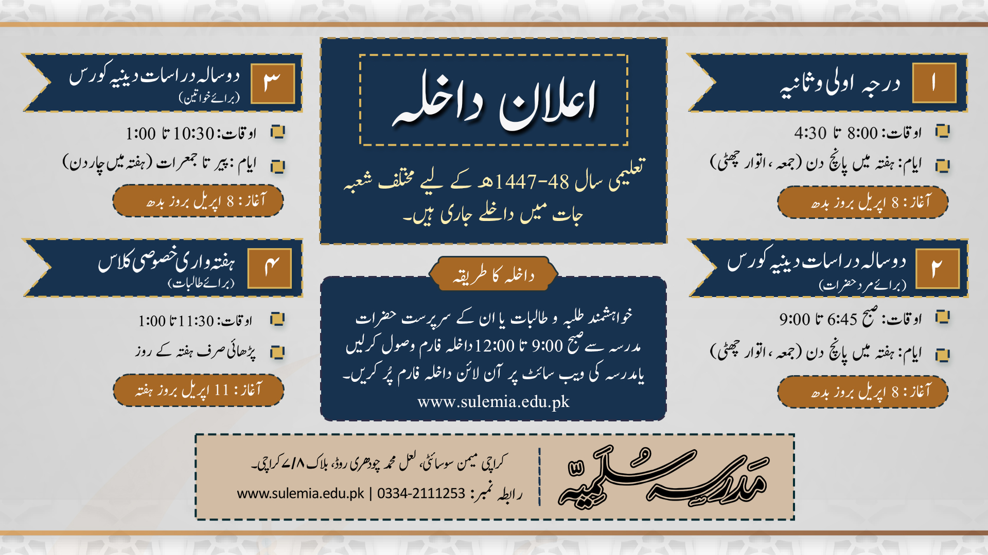 نئے تعلیمی سال کے لئے مختلف شعبہ جات میں داخلے جاری ہیں مدرسہ سلمیہ،کراچی میمن سوسائٹی نزد ہل پارک گول میمن مسجد سے متصل، وفاق المدارس العربیہ پاکستان سے ملحق مدرسہ ہے۔ الحا ق نمبر: 6553 سن الحاق: 2005 شعبہ جات شعبہ حفظ و ناظرہ ( بنین و بنات) دوسالہ دراسات دینیہ کورس برائے خواتین دروس و بیانات درس نظامی دوسالہ دراسات دینیہ کورس برائے مرد حضرات ایک سالہ طالبات کورس شعبہ حفظ و ناظرہ ( بنین و بنات) درس نظامی دوسالہ دراسات دینیہ کورس برائے مرد حضرات دوسالہ دراسات دینیہ کورس برائے خواتین ایک سالہ طالبات کورس دروس و بیانات آن لائن کلاسز کے نیچے والے بٹن پر کلک کریں آن لائن کلاس آپ کا نام فون نمبر پیغام